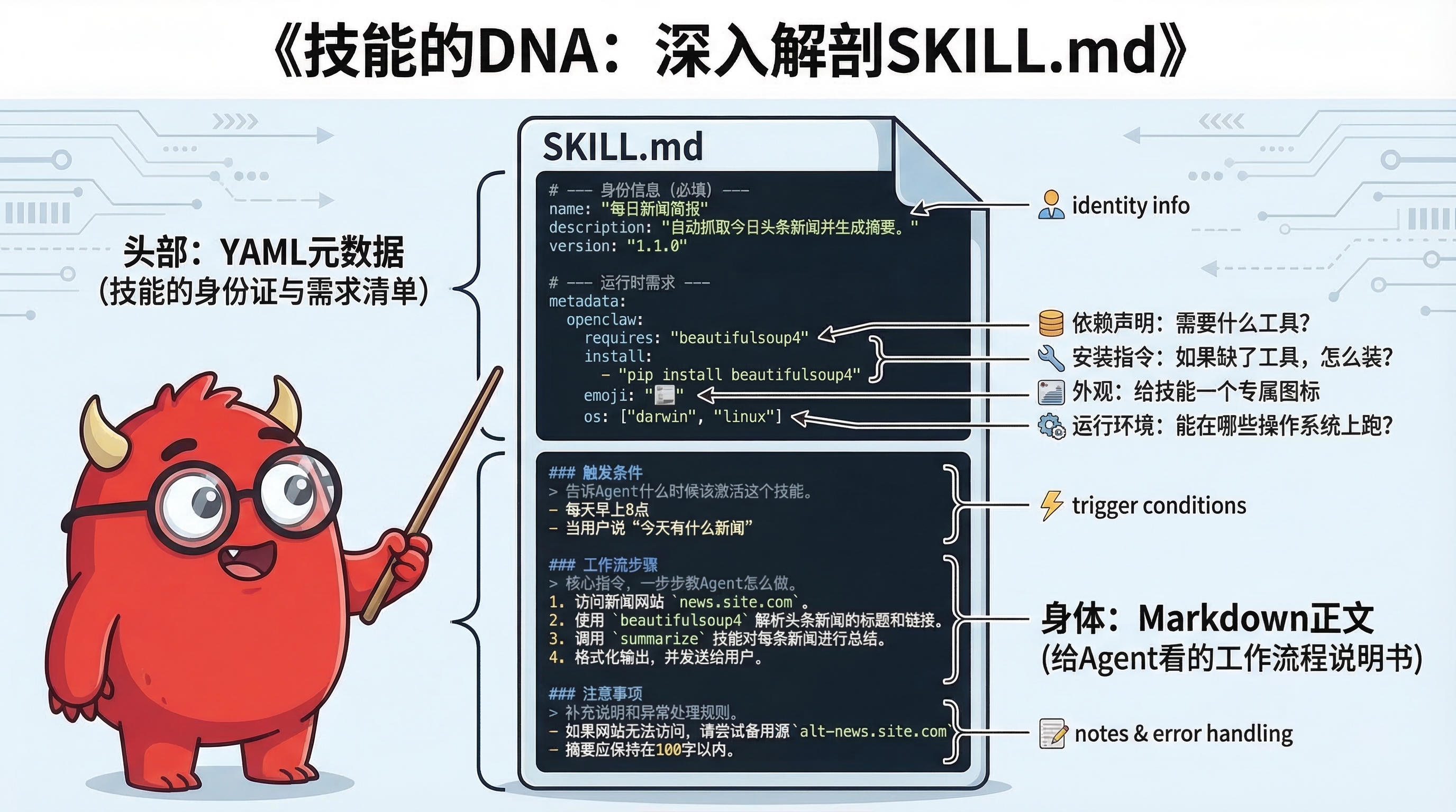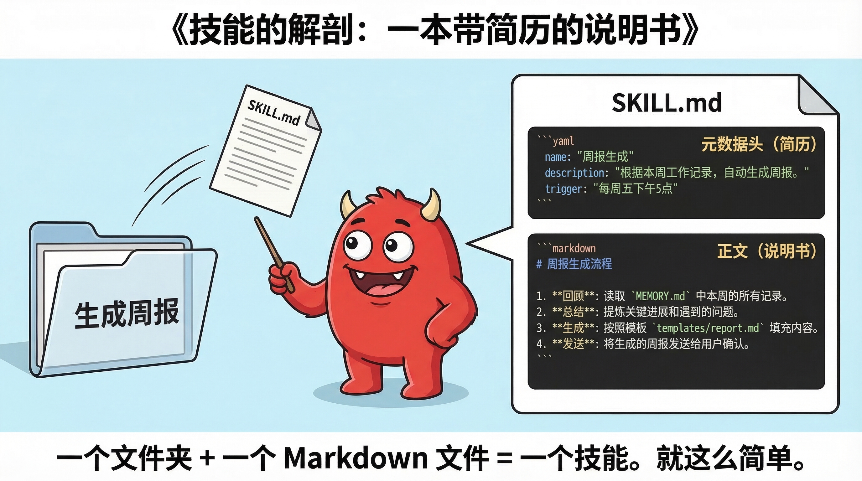 Skill = 一个文件夹 + 一份 SKILL.md,就这么简单。它不是插件、不是二进制、不需要编译——只是一段提示词 + 元数据,告诉 Agent “遇到什么场景、该怎么做”。