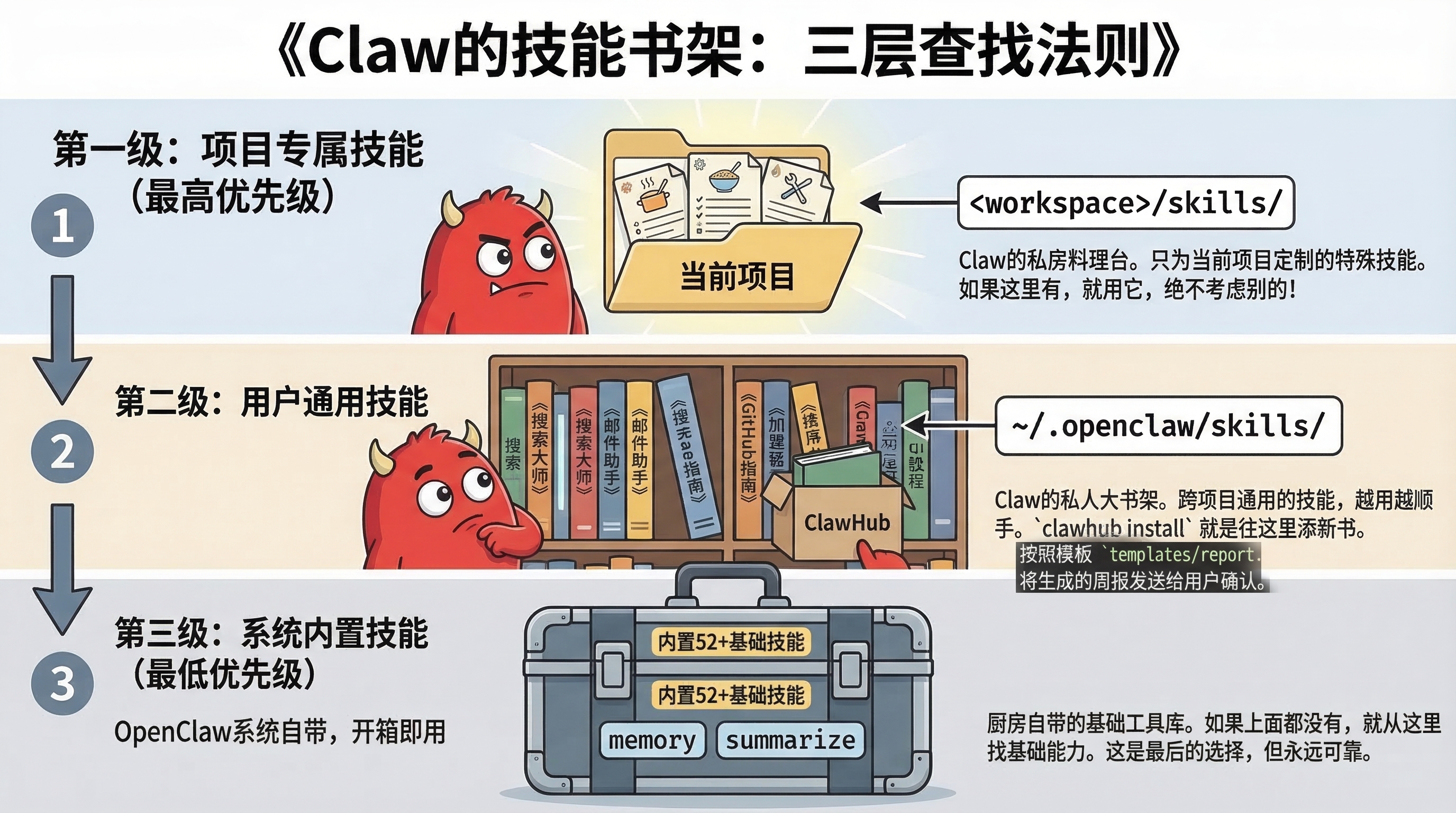 ~/.openclaw/skills/目录下,对所有项目生效。适合个人通用习惯,如 Git 工作流、代码风格 - 内置 Skills(最低优先级) — OpenClaw 自带的技能(如 summarize、apple-reminders),开箱即用